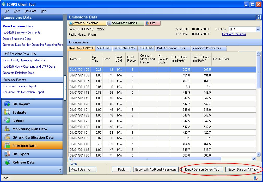 To export all of the emissions data for a selected location and quarter, click the export data on All tabs button in the lower right corner of the screen (see image below). You will be prompted to choose a folder in which to save the exported file. An MS Excel spreadsheet will be created, and each tab on the view emissions screen will appear on a separate worksheet.